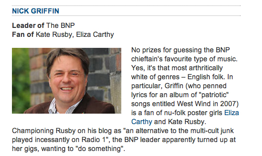 The thing that really bothers me about Koch’s piece, however, is when he says: ‘No prizes for guessing the BNP chieftain’s favourite type of music. Yes, it’s that most arthritically white of genres: English folk.’ These words offend me with their ignorance and prejudice. Ancestral music is blameless in this, and what does my ancestors being white have to do with anything if civilised people know that race is irrelevant?