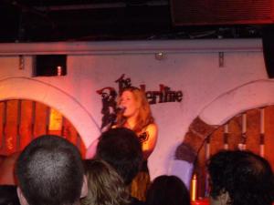 And now to The Borderline…. there’s a tiny extra bar been added next to the bottom of the stairs, which have lost their historic gig posters – I only hope they’re going to put them back. And the cloakroom has been moved right over to the far side next to the merch table, which isn’t actually horrible, but the stage’s backdrop most certainly is. Here’s a picture of how the stage has always looked (from a Dar Williams gig last year):