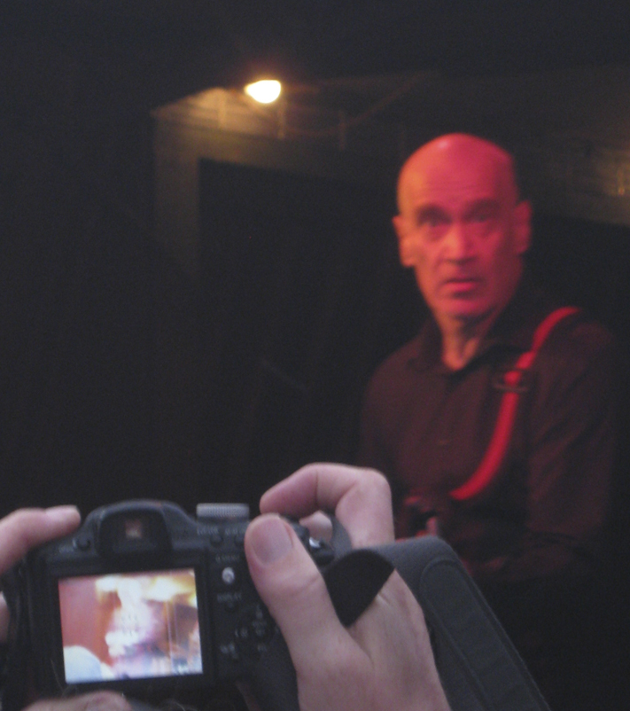 Things looked up considerably when Jackie Leven came onto the stage. Mr P (to whom thanks for the great photo, left), the Browne B and I took up positions on the rail as Jackie started with one of his amusing and dubiously true anecdotes and sang his fine Elegy For Johnny Cash, following it with a funny tale about Ralph McTell and his allegedly sharp temper. The next one, Call Mother A Lonely Field, is one of the many songs Jackie’s written that’s well-observed, carefully written and well sung. It also contains the great lyric, ‘Like young Irishmen in English bars, the song of home betrays us.’